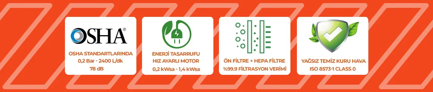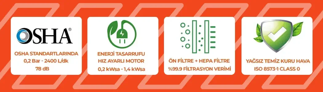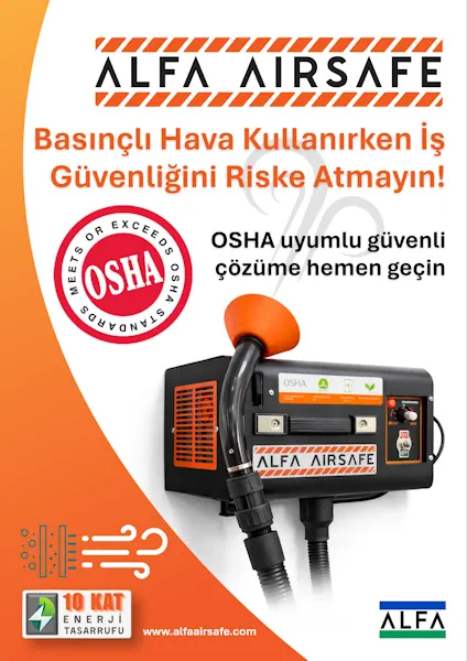 ALFA AIRSAFE OSHA standartlarına uygun şekilde 0,2 bar basınçta 2400 lt/dk, yağsız hava üretir. Bu sayede personel kıyafeti veya cilde doğrudan temas eden hava üflemesinde tehlike oluşturmaz.