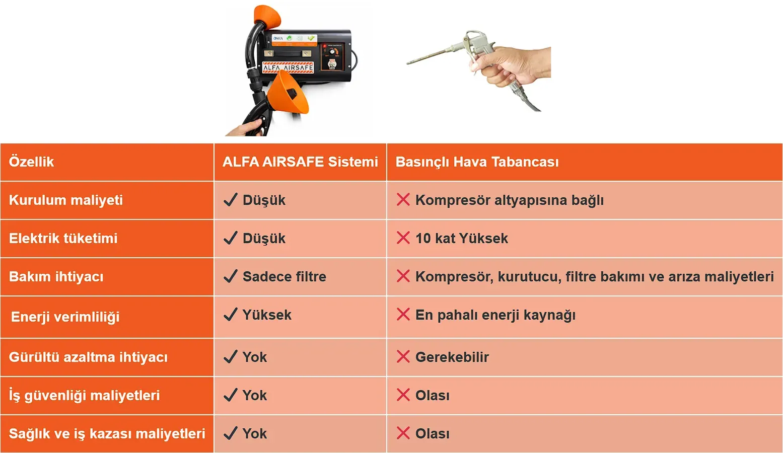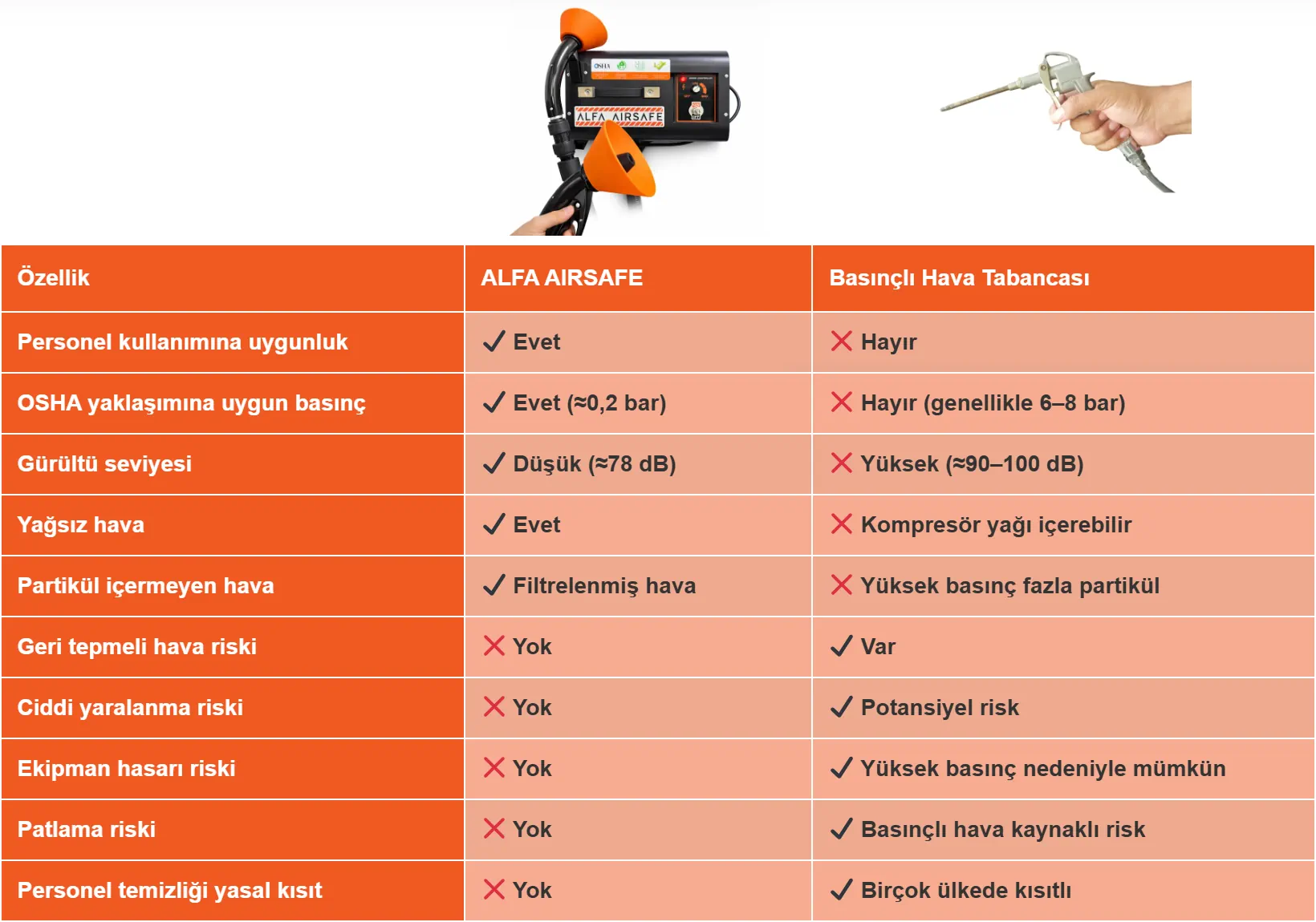| Patlama riski | ✔️ Yok | ❌ Basınçlı hava kaynaklı risk |