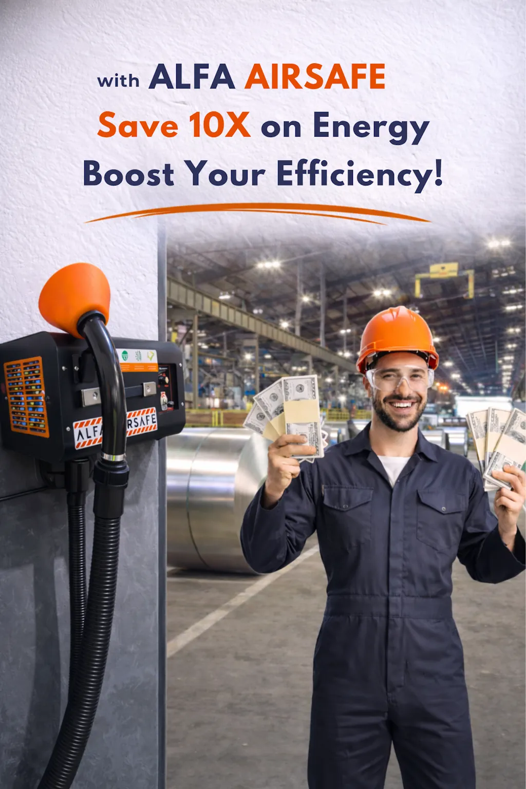 The ALFA AIRSAFE system operates on the low pressure – high flow principle designed for personnel cleaning. This approach ensures operation compliant with OSHA safety principles for the use of compressed air.