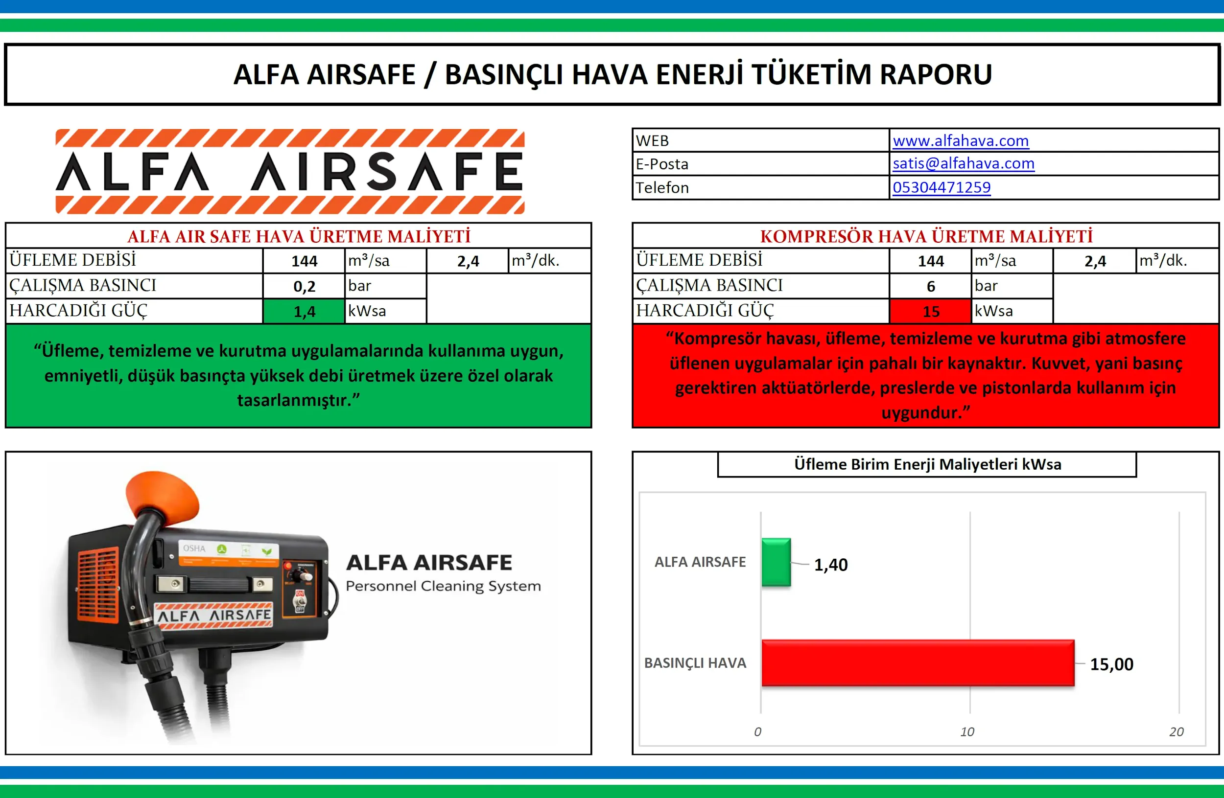 ALFA AIRSAFE sistemi, temizlik uygulamalarında pahalı kompresör havası kullanımını ortadan kaldırarak işletmelerde önemli bir enerji verimliliği iyileştirmesi sağlar.