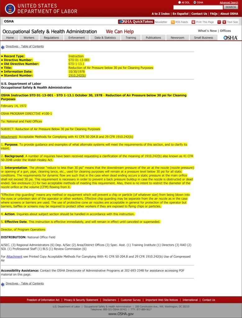 Basınçlı hava kullanımının oluşturduğu riskler nedeniyle, ABD’de iş güvenliği standartlarını belirleyen OSHA (Occupational Safety and Health Administration) bu konuda net bir sınır koymuştur.