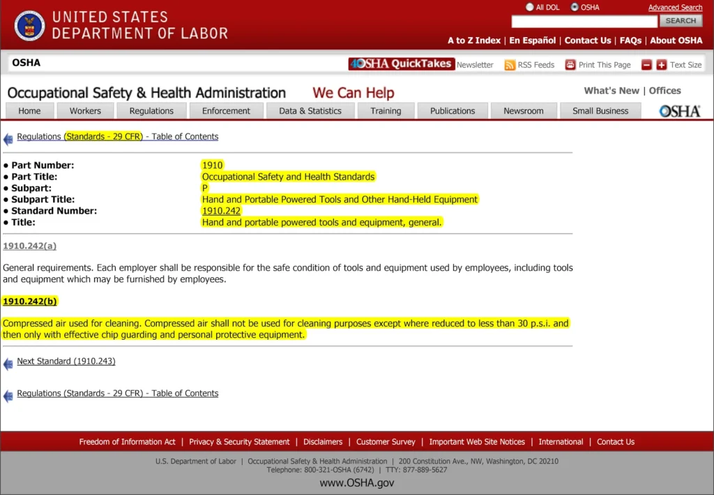 OSHA’ya göre, basınçlı hava kullanılarak yapılan temizlik işlemlerinde oluşabilecek talaş, toz veya parçacıkların operatörün ya da çevredeki çalışanların gözlerine veya açık derilerine ulaşmasını önleyecek koruyucu önlemler alınmalıdır.